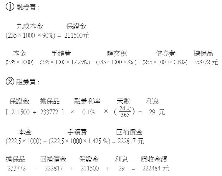 - 利息 : [ (保證金 + 擔保品)*融券利率 *天數 ] / 365