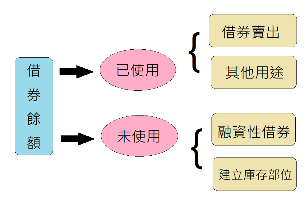 借券餘額是指借入有價證券後尚未還券的數額,而借券餘額可區隔為已使用及未使用二部分,已使用的餘額如果是用於賣出,就稱為借券賣出餘額,性質上與信用交易的融券餘額相同。另一方面,未使用的借券餘額,其中大部分為融資性借券擔保品以及建立庫存部位使用。