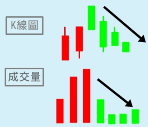 - 代表多方接手意願不高,屬於跌勢的開始,還有得跌,仍視為賣出訊號。反彈注意價量背離或呈現量大不漲的跡象。